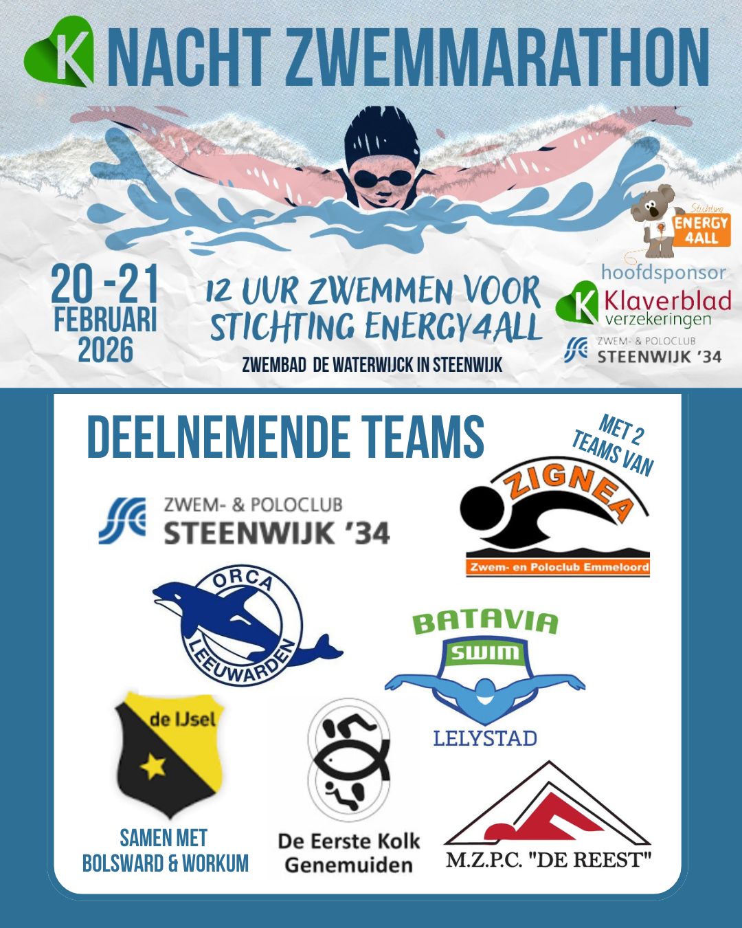 Zwemvereniging Z&PC Steenwijk 1934 organiseert in de nacht van vrijdag 20 februari op zaterdag 21 februari 2026 voor de derde keer een nachtzwemmarathon in zwembad De Waterwijck in Steenwijk. Dit jaar steunen ze met hun enorme inspanning een goed doel: Stichting Energy4All. Ze geven hun energie voor iedereen met een energiestofwisselingsziekte.